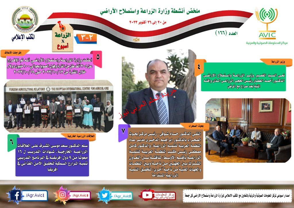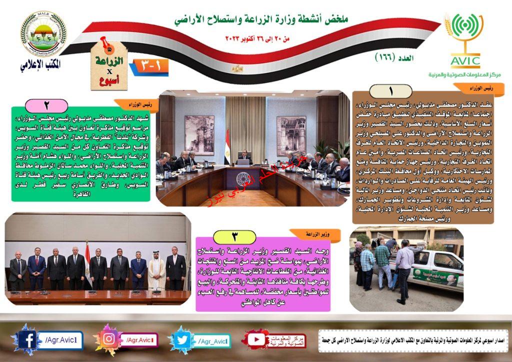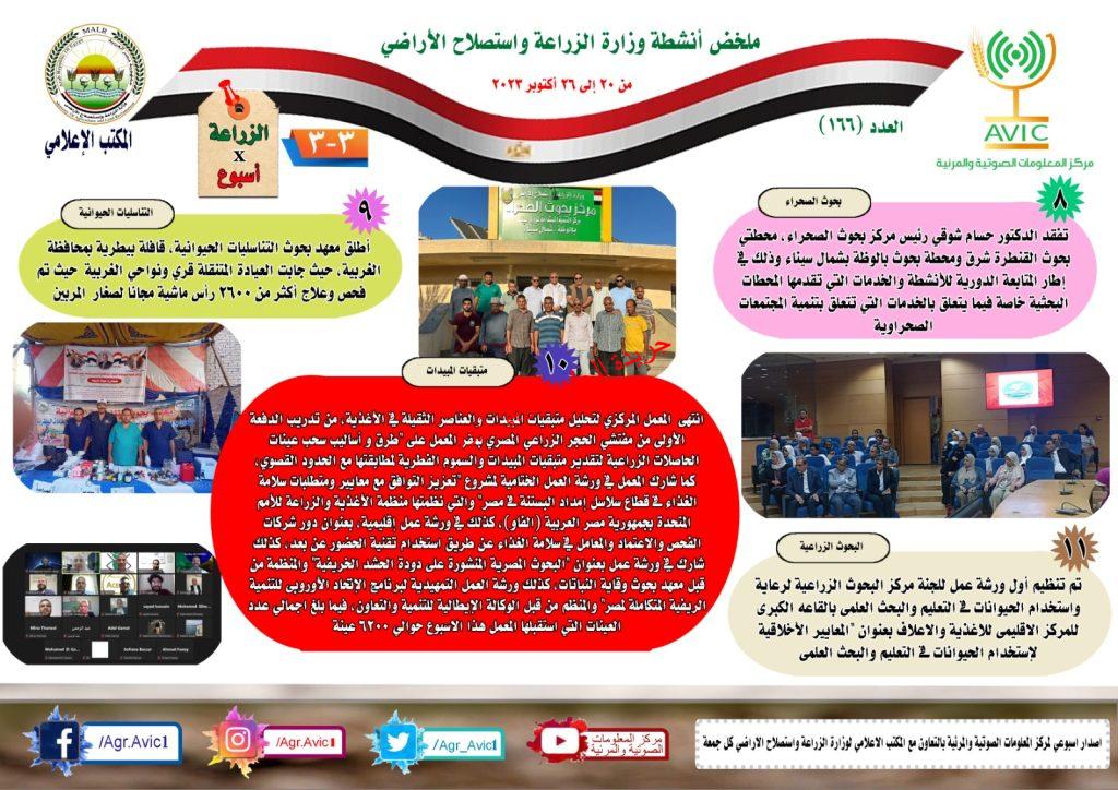 أصدر مركز المعلومات الصوتية والمرئية، التابع لوزارة الزراعة واستصلاح الاراضي، “الانفوجراف الاسبوعي” في نسخته رقم ١٦٦ ، حول الحصاد الاسبوعي لأهم أنشطة الوزارة، خلال الاسبوع الماضي في الفترة من ٢٠ وحتى ٢٦ اكتوبر الجاري، وذلك بالتعاون مع المكتب الاعلامي للوزارة، كما أصدر المركز ايضا ملخصا بالفيديو، حول انشطة الوزارة خلال نفس الفترة.