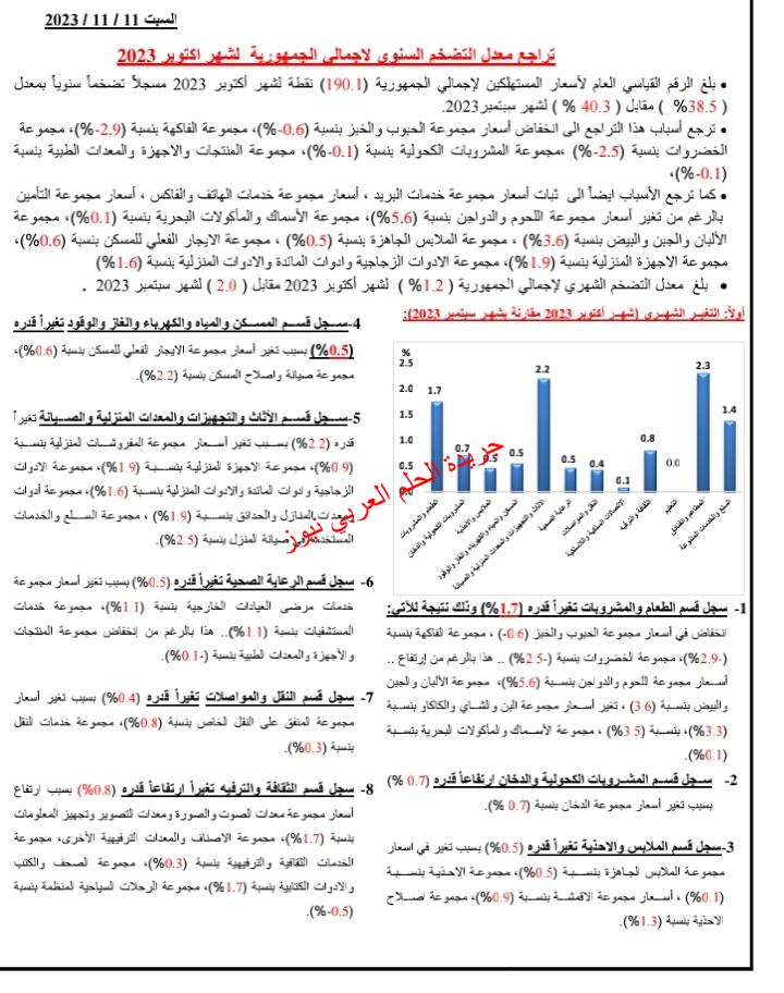 • بلغ الرقم القياسي العام لأسعار المستهلكين لإجمالي الجمهورية (190.1) نقطة لشهر أكتوبر 2023 مسجلاً تضخماً سنوياً بمعدل (38.5% ) مقابل (40.3% ) لشهر سبتمبر2023.