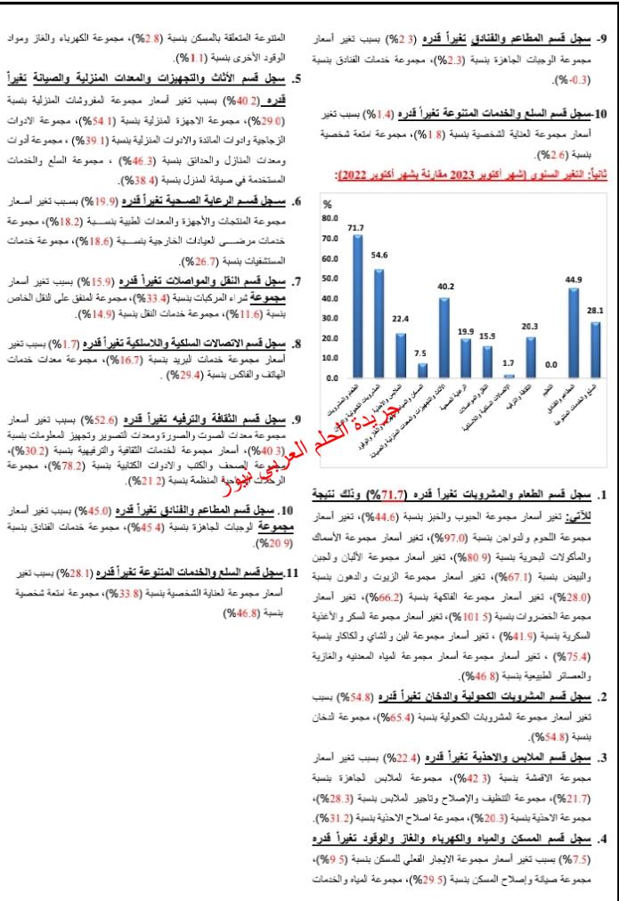 ثانياً: التغيرالسنوي (شهرأكتوبر2023مقارنة بشهر أكتوبر2022): 1. سجل قسم الطعام والمشروبات تغيراً قدره (71.7%) وذلك نتيجة للآتي: تغيرأسعار مجموعة الحبوب والخبز بنسبة (44.6%)، تغيرأسعار مجموعة اللحوم والدواجن بنسبة (97.0%)، تغيرأسعار مجموعة الأسماك والمأكولات البحرية بنسبة (80.9%)، تغير أسعار مجموعة الألبان والجبن والبيض بنسبة (67.1%)، تغير أسعار مجموعة الزيوت والدهون بنسبة (28.0%)، تغير أسعار مجموعة الفاكهة بنسبة (66.2%)، تغير أسعار مجموعة الخضروات بنسبة (101.5%)، تغير أسعار مجموعة السكر والأغذية السكرية بنسبة (41.9%)، تغير أسعار مجموعة البن والشاي والكاكاو بنسبة (75.4%)، تغير أسعار مجموعة أسعار مجموعة المياه المعدنيه والغازية والعصائر الطبيعية بنسبة (46.8%).