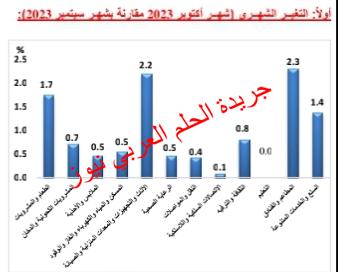 • بلغ معدل التضخم الشهريلإجمالي الجمهورية ( 1.2% ) لشهر أكتوبر 2023 مقابل(2.0) لشهر سبتمبر 2023. أولاً: التغيــرالشهــرى(شهــر أكتوبر2023مقارنة بشهـر سبتمبر2023): 1- سجل قسم الطعام والمشروبات تغيراً قدره (1.7%) وذلك نتيجة للآتي: