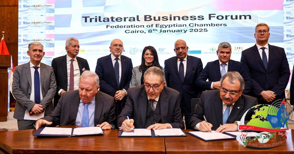 وخلال فعاليات المنتدى، شهدت الدكتورة رانيا المشاط، توقيع بروتوكول تعاون بين كل من اتحادات الغرف المصرية واليونانية والقبرصية، لإنشاء مجلس أعمال مشترك بين الدول الثلاث بهدف تعزيز التعاون الثلاثي وزيادة حجم التبادل التجاري والاستثمارات المشتركة، حيث وقع البروتوكول عن الجانب المصري السيد/ أحمد الوكيل، رئيس اتحاد الغرف التجارية المصرية، وكل من رئيس اتحاد الغرف القبرصية، ونائب رئيس غرف اليونان.